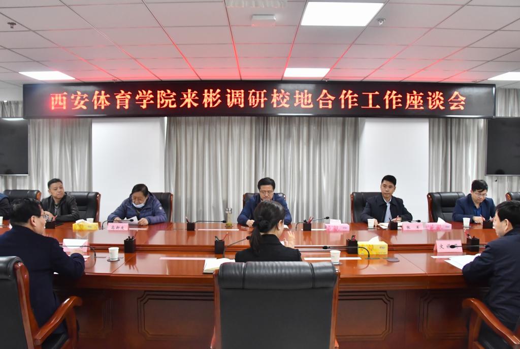 随后召开的座谈会上,张虹介绍了彬州市整体发展状况及体育工作开展情况,他表示,彬州市委市政府高度重视体育事业发展,大力开展全民健身活动,曾获得“全国群众体育先进单位”“陕西省全民健身示范县”荣誉称号。希望与万象城allwincity官网开展校地合作,助力彬州开启体育事业发展新篇章。王选平对彬州市体育工作开展情况进行了详细的说明。吕锋同志介绍了彬州市体育教育情况。万象城党委校长办公室主任张军对万象城基本情况和此次校地合作的方向做了介绍。随后双方围绕合作专业及细节问题进行了深入探讨与交流。