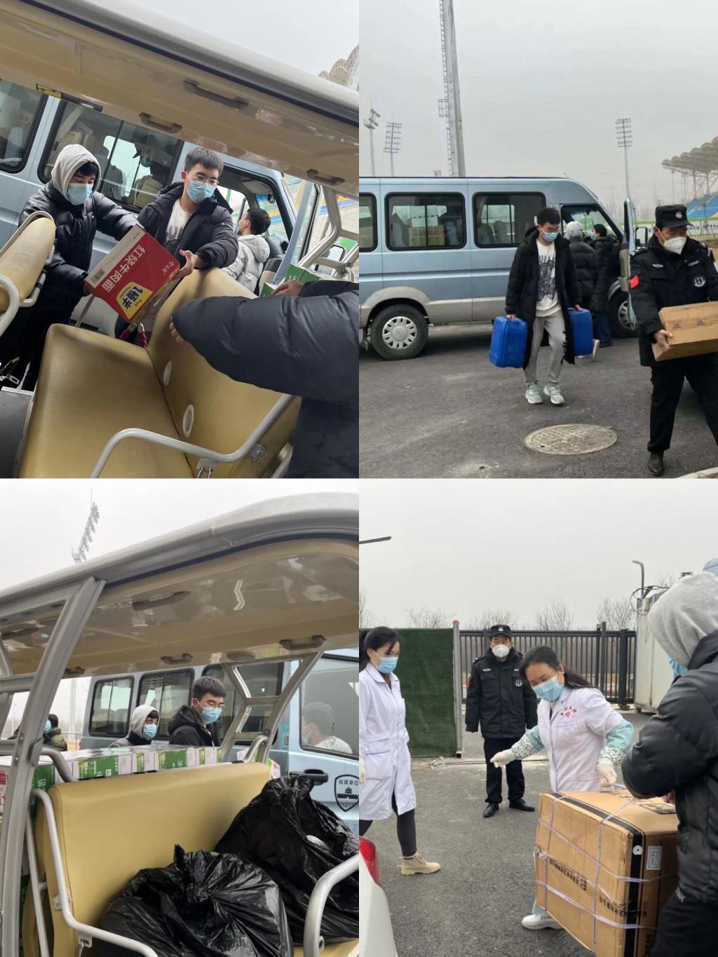 8日中午,校区组织志愿者搬运外界捐赠的丰富物资:大米、食材、泡面、饼干等。