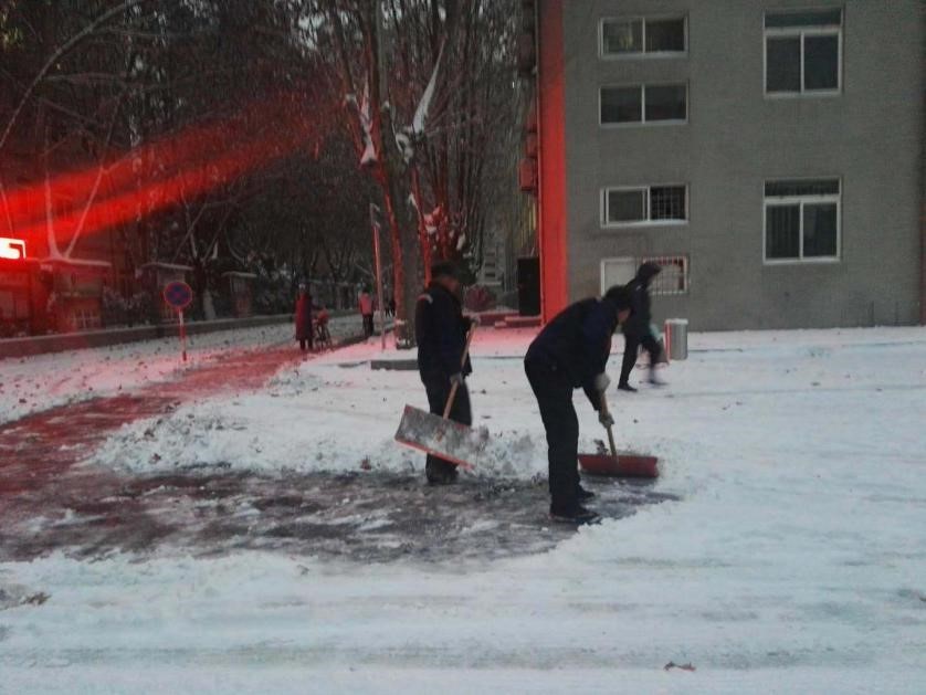 2018年的第一场雪,持续下了一整夜,后勤管理处提预案,准备好纸箱、地毯,为保证师生出行安全,后勤管理处全体干部、职工立即行动起来,清除积雪和积冰。