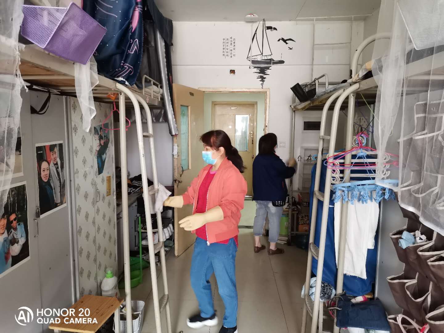 (二)全面清洁 不留死角 营造健康安全环境 为了使学生在开学后拥有一个健康、安全、干净的居住环境,学生公寓管理中心的工作人员继每日对公寓公共区域清洁消毒外,开始对学生宿舍内部进行全面清洁消毒工作。工作人员认真、专业、仔细、全面,绝不留下一个死角,同时认真做好消毒记录。