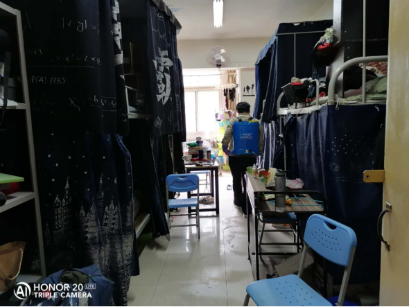 一、疫情防控工作 (一)为严格落实学校各项疫情防控工作,迎接学生返校,后勤管理处(集团)保洁绿化中心在对工作人员进行体温检测、登记后,根据校医院要求严格做好校园、教室、家属区消毒清洁工作。 1、教学楼、行政楼、2号楼、家属区、垃圾场消杀2次; 2、道路积水清扫; 3、教学楼室内卫生保洁; 4、完成万象城下沉广场卫生保洁工作,重点清扫下沉广场卫生死角; 5、完成行政楼会议室保洁工作; 6、完成校园绿植养护; 7、完成教学师生体温检测工作,检测师生共计4人次。 (二)后勤管理处(集团)学生公寓管理中心在对工作人员进行体温检测、登记后,严格按照校医院要求做好学生公寓清洁、消毒、通风及学生体温检测工作。