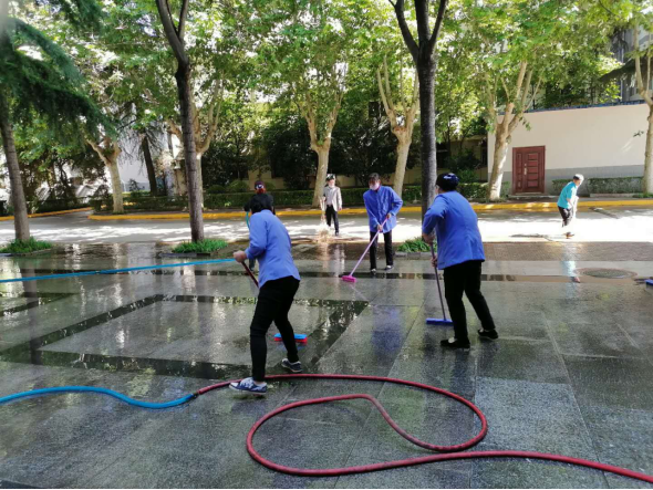 一、疫情防控工作 (一)后勤管理处(集团)保洁绿化中心在对工作人员进行体温检测、登记后,严格按照校医院要求做好万象城校园环境、教室清洁、通风、消毒工作。 1、教学楼、行政楼、2号楼、家属区、垃圾场消杀; 2、冲洗教学楼门前台阶、地面; 3、完成实验楼一至六楼的卫生保洁,重点清扫卫生死角; 4、行政楼楼梯冲洗;完成行政楼大会议室卫生保洁工作; 5、清理6号公寓楼周边垃圾; 6、冲洗校园主干道; 7、校园绿植养护。