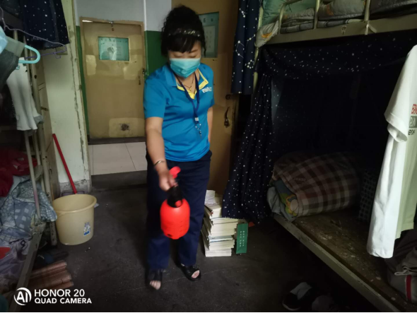 一、疫情防控工作 (一)后勤管理处(集团)保洁绿化中心在对工作人员进行体温检测、登记后,严格按照校医院要求做好万象城校园环境、教室清洁、通风、消毒工作。 1、教学楼全天服务师生共计50人次; 2、教学楼、行政楼、2号楼、家属区消杀2次,通风3次; 3、完成家属区、垃圾房清洁消杀工作,并做好消杀记录; 4、完成清扫行政楼二层会议室工作; 5、完成实验楼LED屏维修工作; 6、完成教学楼投影仪安装工作; 7、完成校园卫生保洁工作; 8、完成校园绿植养护及修剪工作; 9、完成家属区楼道清扫工作。 (二)后勤管理处(集团)学生公寓管理中心在对工作人员进行体温检测、登记后,严格按照校医院《学生公寓消毒指南》要求做好学生公寓清洁、消毒每日2次,通风工作每日3次,每次30分钟,以及学生体温检测工作。 学生公寓截止5月20日18点共有837名同学返校,其中己有669名同学考完试离校回家,实际在校人数168名同学。学生公寓管理中心严格按照离校手续做好离校学生宿舍安全检查工作,确保水电关闭。今日服务学生共计589人次。