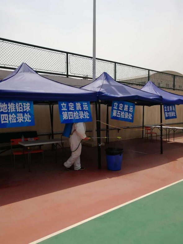 (二)后勤管理处(集团)餐饮中心5月30日全天服务师生27人次。 (三)后勤管理处(集团)场馆中心在对工作人员进行体温检测、登记后,严格按照校医院《场馆消毒指南》要求做好场馆(地)清洁、消毒、通风及师生体温检测工作,具体如下: 1、竞校训练、室外对教职员工开放场地服务师生情况: 田径馆竞技体校训练1人 以上共计1人次 2、附楼办公体温检测8人次  3、消杀、通风、卫生保洁次数: 场馆公共区域消毒2次; 场馆通风2次; 卫生保洁3次。 4、保障招生考试情况: 考试场地(田径场)消杀4次; 检录场地(篮球场)消杀4次; 通道(田径馆)消杀4次; 考试用卫生间(田径场、综合馆1层、篮球场)消杀4次; 完成考试用场地值班管理工作; 完成考试用场地清洁保障工作; 完成考试器材、物资保障工作; 完成考试场地设置、维护及相关保障工作。