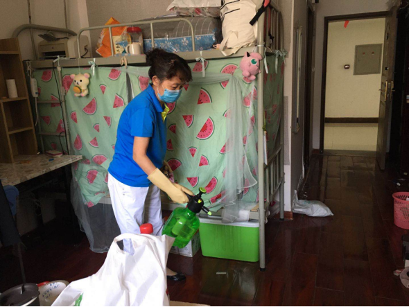 一、疫情防控工作 (一)后勤管理处(集团)保洁绿化中心在对工作人员进行体温检测、登记后,严格按照校医院要求做好万象城校园环境、教室清洁、通风、消毒工作。 1、教学楼全天服务师生共计50人次; 2、教学楼、行政楼、2号楼、家属区消杀2次,通风3次; 3、保障研究生考试; 4、教学楼道路外围清洁; 5、招生重点区域环境卫生清理; 6、完成校园绿植养护及修剪工作; 7、日常保洁工作。 (二)后勤管理处(集团)学生公寓管理中心在对工作人员进行体温检测、登记后,严格按照校医院《学生公寓消毒指南》要求做好学生公寓清洁、消毒每日2次,通风工作每日3次,每次30分钟,以及学生体温检测工作。 学生公寓截止6月3日18点累计共有1185名同学返校,其中己有1080名同学考完试离校回家,实际在校人数105名同学。学生公寓管理中心严格按照离校手续做好离校学生宿舍安全检查工作,确保水电关闭。今日服务学生共计536人次。