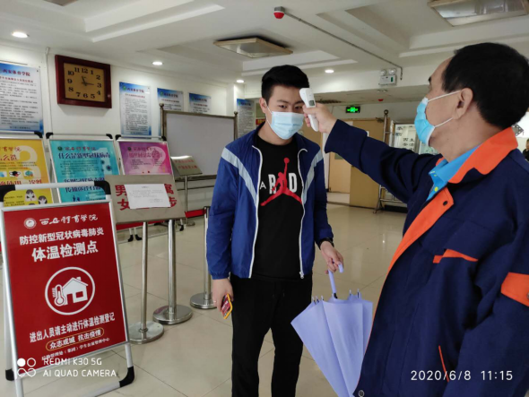 一、疫情防控工作 (一)后勤管理处(集团)保洁绿化中心在对工作人员进行体温检测、登记后,严格按照校医院要求做好万象城校园环境、教室清洁、通风、消毒工作。 1、教学楼、行政楼、2号楼、家属区消杀2次,通风3次; 2、垃圾房消杀3次; 2、教学楼道路外围清洁; 3、完成校园绿植养护及修剪工作; 4、日常保洁工作。 (二)后勤管理处(集团)学生公寓管理中心在对工作人员进行体温检测、登记后,严格按照校医院《学生公寓消毒指南》要求做好学生公寓清洁、消毒每日2次,通风工作每日3次,每次30分钟,以及学生体温检测工作。 学生公寓截止6月8日18点累计共有1225名同学返校,其中己有1147名同学考完试离校回家,实际在校人数78名同学。学生公寓管理中心严格按照离校手续做好离校学生宿舍安全检查工作,确保水电关闭。今日服务学生共计205人次。