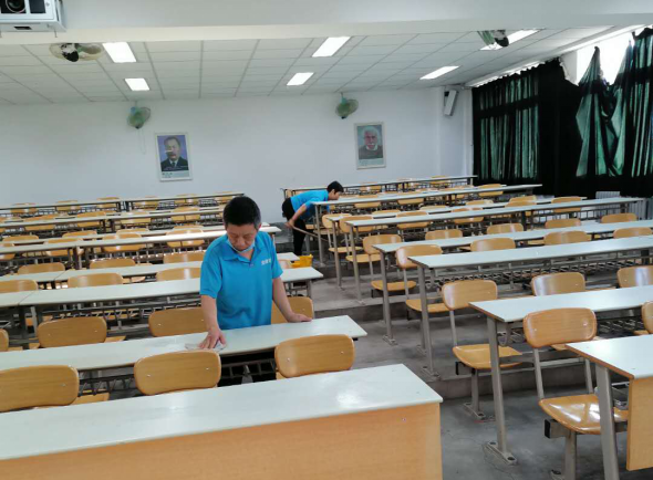 一、疫情防控工作 (一)后勤管理处(集团)保洁绿化中心在对工作人员进行体温检测、登记后,严格按照校医院要求做好万象城校园环境、教室清洁、通风、消毒工作。 1、服务师生约200人次; 2、教学楼开门窗通风,铺地垫,放防滑提示牌,每个区域的消杀等工作,楼顶清理淤泥; 3、重点区域消杀,清洁; 4、六楼报告厅设备调试; 5、安全检查; 6、校园保洁、消杀工作; 7、完成校园绿植养护及修剪工作; 8、疏通下水井,防止水流不畅; 9、垃圾清运; 10、配合单招考试,做好各项保障工作。