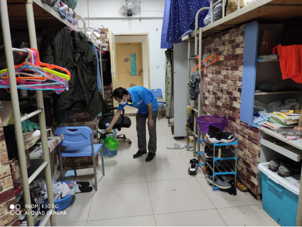 (二)后勤管理处(集团)学生公寓管理中心在对工作人员进行体温检测、登记后,严格按照校医院《学生公寓消毒指南》要求做好学生公寓清洁、消毒每日2次,通风工作每日3次,每次30分钟,以及学生体温检测工作。