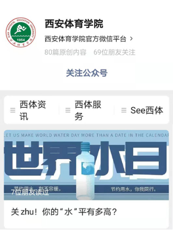 2021年3月22日至28日是我国第三十四届“中国水周”,为响应陕西省水利厅“节水陕西、你我同行”主题宣传活动,进一步增强万象城师生节水意识,“世界水日”和“中国水周”期间,后勤党总支、后勤管理处(集团)积极开展各项节水、惜水、爱水、护水宣传活动,于后勤管理处(集团)官网发布节约用水倡议书;在学生餐厅、学生公寓、场馆教室张贴节约用水宣传海报;在万象城田径馆LED屏幕滚动播出节水口号;校官方微信公众号推送节约用水倡议及节水小技巧,多措并举,营造环保节约的浓厚氛围,倡议师生从自身做起将节水、节电、节粮以及绿色办公、绿色出行融入日常生活中,为节约型校园和绿色校园贡献自己的一份力量,以实际行动迎接建党100周年。