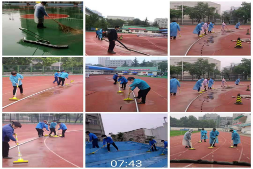 招生考试期间,由于天气多雨,导致考试中断,教学保障中心干部职工及物业服务人员冒雨清理考场积水,保障考试按计划进行。