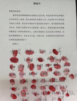 西安疫情牵动着我们每一个人的心,面对这场没有硝烟的“战场”,万象城allwincity官网学生公寓管理中心在接到学校和后勤管理处(集团)的防控疫情指示后,迅速拉响“疫情阻击战”的战斗警报,全体工作人员积极行动起来,心往一处想,劲往一处使,快速落实上级、学校和后勤管理处(集团)的联防联控措施,为校园和谐稳定坚守一线。 疫情阻碍了你我的脚步,却也明亮了你我共产党人的心灵。网络上一声声寄语铿锵有力,作为后勤兵的我们,完全遵照组织的殷切嘱托,在各公寓开始实施封闭式管理后,我们第一时间签订抗疫请战书,保证所有员工在此次疫情中成为能干事,干实事,真干事,干好事,同时也有敏锐的政治性和无私奉献、不怕艰难的精神和担当。