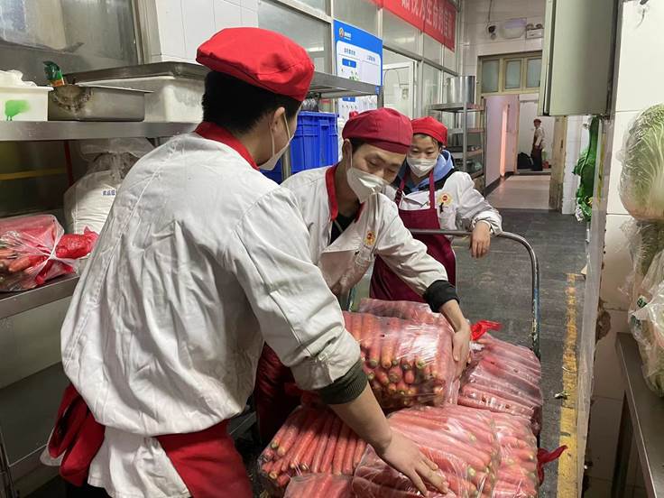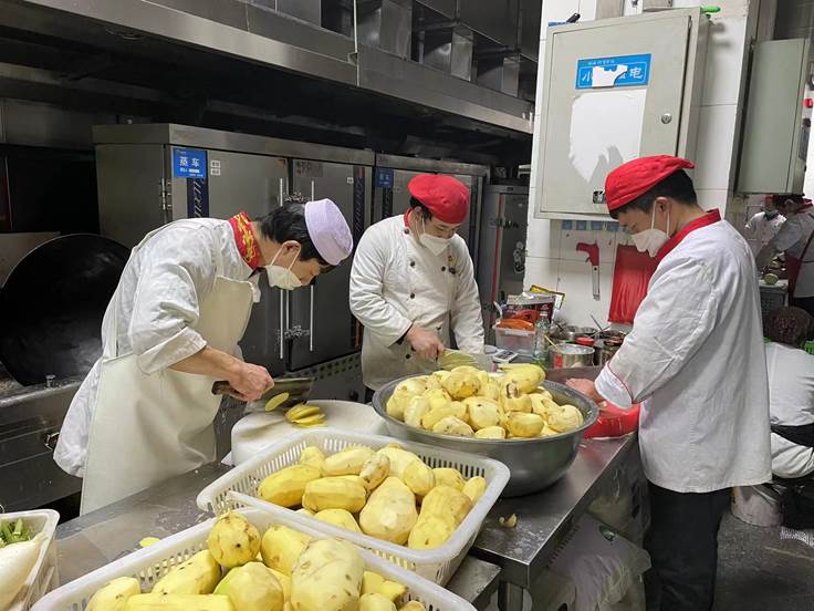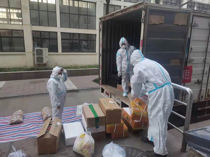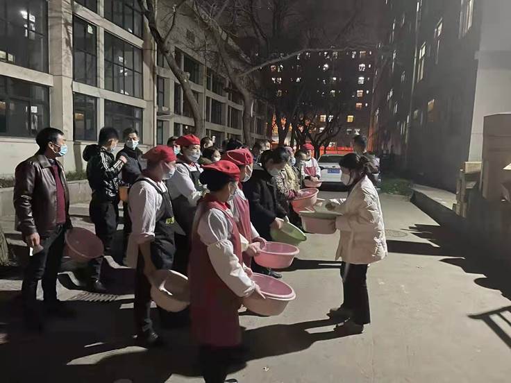 2021年12月22日,西安市进行实行封控管理,两校区学生餐厅第一时间对主食、干调、冻货、易耗品等原材料进行囤货,克服运输、物资困乏等困难,调配充足物资,持续补给,全力保障全校师生就餐,同时提前考虑,主动工作,提前调配打包餐具,在学校实行封闭管理前为学生餐厅工作人员安排住宿,发放生活必须品。