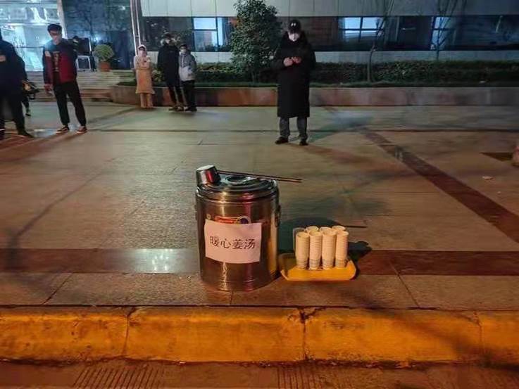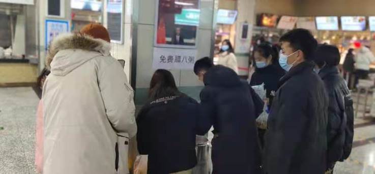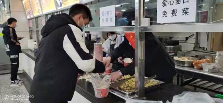 为志愿者赠送热奶茶;为校医院、核酸检测工作人员、防疫人员送上免费餐;在天气严寒时,为全校师生、防疫人员送去暖心姜汤;将社会捐赠蔬菜及两校区餐饮公司捐赠食材加工制作18000份免费午餐、晚餐;在腊八节,为师生供应免费腊八粥。