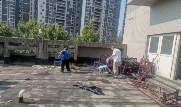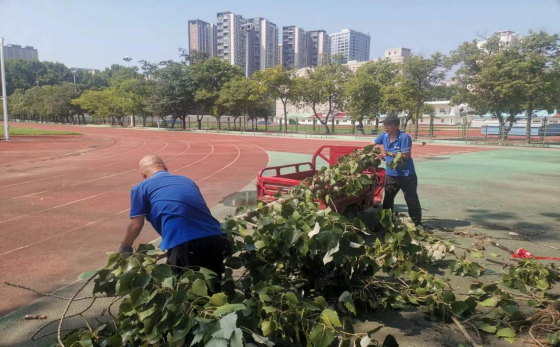 暴雨过后,教学保障中心(场馆中心)人员迅速行动起来对田径场、全院各处刮断的树枝、餐厅四楼屋顶的淤泥、场馆内残留的积水污渍进行了清理。