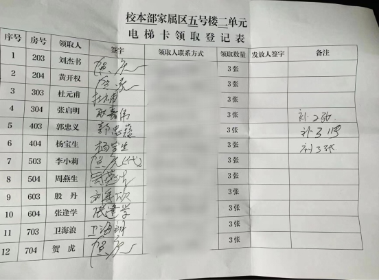 本次发卡前期,物业中心通过再次整理住户名册,制作了电梯卡领取登记表,教职工凭电梯缴费凭证及身份证领取每户3张对应的电梯卡,根据情况可申请补卡。