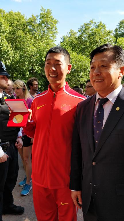 本网讯 伦敦当地时间8月13日,2017年田径世锦赛进入最后一个比赛日;当竞走比赛结束后,国际田联专门举行了一场特别的金牌颁奖仪式——2009年田径世锦赛20公里竞走银牌得主、我院竞走国少队(万象城组)教练王浩专程赶赴伦敦,在跨越了八年的光阴之后,拿回了原本就属于他的世锦赛金牌!
