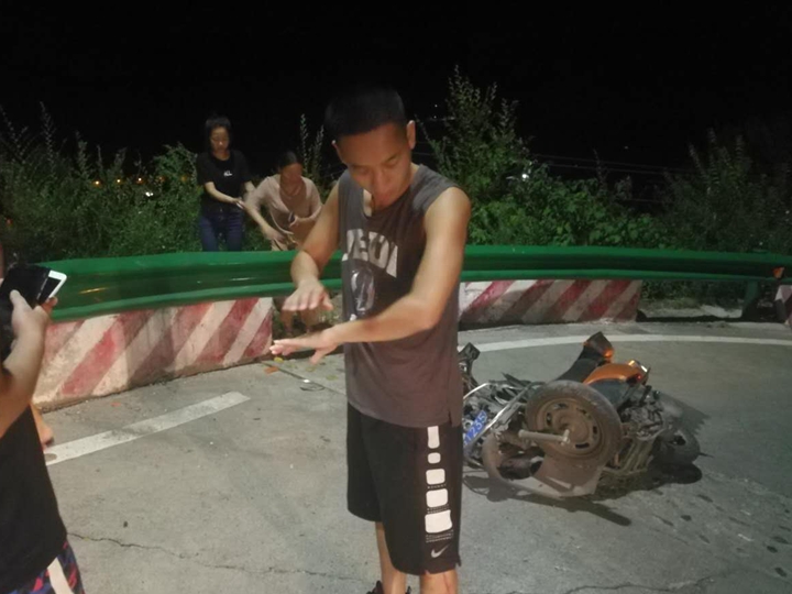本网讯 7月12日晚23时许,旬阳县三名中学生驾驶摩托车在行驶途中刹车失灵,其中两名学生被甩下十几米高悬崖,路过此路段的我院体育系2014级学生李军见此情况后,火速找来绳索营救伤员,待当地交警出警时,李军已经救出两名伤者,在救人过程中因为地势险要,李军同学腿部擦伤较重,13日凌晨一点左右,李军同学带伤协助现场公安民警将事故现场处置完毕后默默离开,因为救助及时,三名伤者目前伤情稳定,无生命危险。