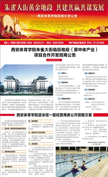 本网讯 6月5日,我院在《西安晚报》第14版整版刊登广告《朱雀大街黄金地段 共建共赢共谋发展——万象城allwincity官网招商引资公告》,决定对朱雀路土地项目进行合作开发,欢迎投资商加盟共谋发展,相关链接为: