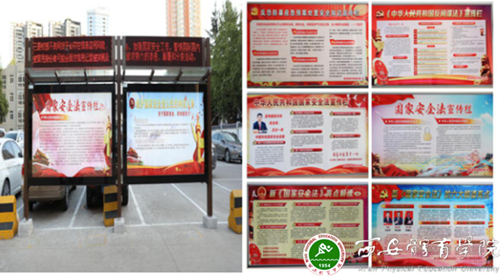 党委宣传部通过官方微信公众平台、官方微博、校园网、校园广播等媒体平台积极宣传国家安全知识,利用行政楼、教学楼以及田径馆前的电子屏对国家安全宣传教育口号进行滚动播出。保卫处通过宣传橱窗、板栏等形式展示了新《国家安全法》、《中华人民共和国反间谍法》等国家安全相关内容。