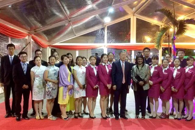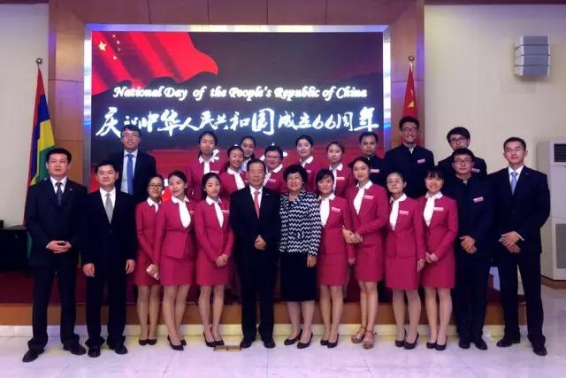 2015年国庆节,在使馆“庆祝中华人民共和国成立66周年”招待会上,一线管理单位所有工作人员与援外志愿者合影,正中间为中华人民共和国驻毛里求斯共和国大使馆经济商务参赞处的王贺亮参赞夫妇,第一排右二为陈巍之。