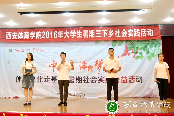 本网讯 为纪念中国共产党建党95周年暨红军长征胜利80周年,深入开展“两学一做”学习教育,引导当代大学生理解贯彻国家“一带一路”倡议,树立与祖国共奋进、与时代同进步、与社会齐发展的信念,积极投身“三个陕西”建设,我院于7月12日至19日开展了主题为“中国梦 体育梦”体育文化走基层的大学生暑期“三下乡”社会实践活动,4支服务队一同奔赴陕西安康、延安等地开展全民健身示范与指导、体质测量、体育艺术展演、课题调研、体育法律法规宣讲、普通话推广等内容的社会实践活动。志愿者们积极投入、默契配合,圆满地完成了各项任务,收到了良好的社会反响。