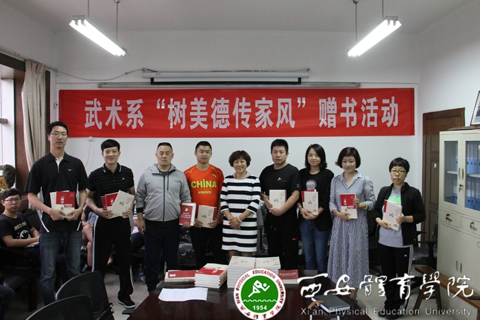 活动中,武术系党总支书记梁咏梅把“两学一做”学习资料以及《好家风就有好家教》共计100余本图书亲手送到武术系每一位党员手中,要求各党支部组织党员集中学习,希望全系党员利用业余时间深学细究,不断吸收“精神食粮”,武装自己的头脑,做思想上、政治上、品质上过硬的共产党员,并将良好风尚带入到家庭文明建设中去。