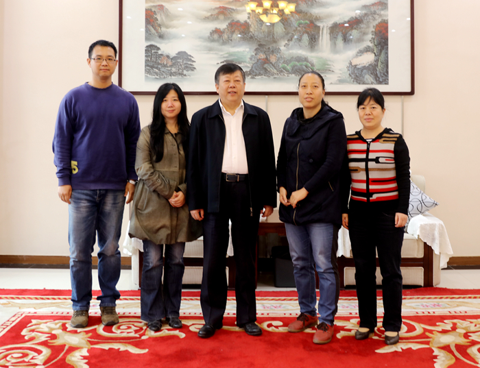 刘岩司长(中)与我院教师代表(左起:张恩利、郭春玲、张彩虹、魏鹏娟)合影