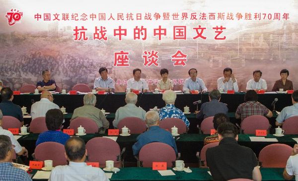 本网讯近日,中国文联在北京举行纪念中国人民抗日战争暨世界反法西斯战争胜利70周年“抗战中的中国文艺”座谈会。中国文联主席孙家正,中国文联党组书记、副主席赵实,中国文联党组副书记、副主席李屹,党组成员、副主席左中一、夏潮、李前光,党组成员郭运德、陈建文,副主席冯远、刘兰芳、李雪健、李维康、杨承志、周涛、赵化勇、徐沛东,中宣部文艺局巡视员、副局长孟祥林,抗战老文艺家代表以及各艺术门类知名艺术家代表、文艺理论评论家代表、各全国文艺家协会和文联机关有关同志参加座谈会。全国20多家新闻媒体到场进行了现场采访和纪实报道,中央电视台新闻联播也对此次座谈会议进行了报道。正在中国文联进修学习的我院体育艺术系教师闫家军作为青年文艺人才也应邀参加了此次会议,通过对座谈会的学习和探讨,使他深受革命精神的鼓舞,受益匪浅,从而对文艺创作和专业教学进一步确立了更加明确的目标和方向。