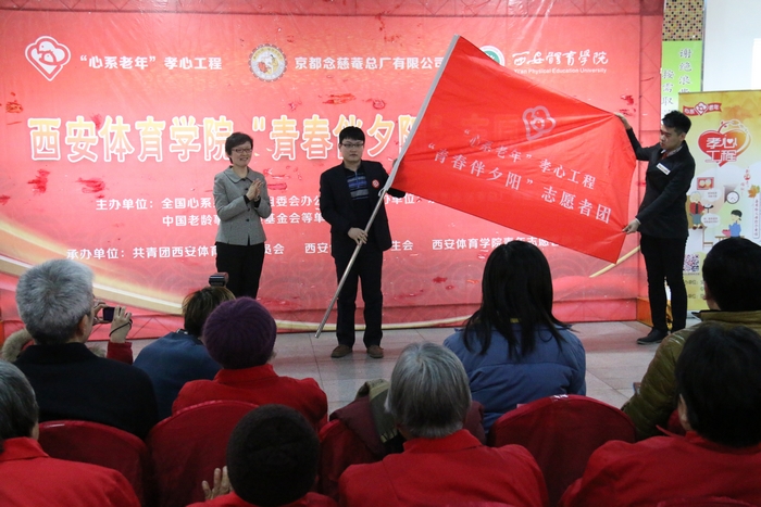 活动中,主、协办单位共同向西安市未央区老年福利服务中心、西安市三桥老年公寓捐赠了价值近六万元的物资。与会领导共同为张家堡街道办事处、莲湖区环城西路街道等西安市街道、社区授“心系老年”活动基地牌,为西安地区的“心系老年”孝心工程“青春伴夕阳”高校志愿者团的各高校颁发感谢证书,我院代表各高校接旗。