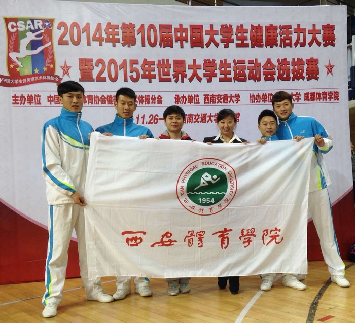 由体育艺术系健美操教研室教师王猛带领的健美操队参加了大学生体育院系A组的男子单人操和男子三人操比赛。其中,周锦、刘德宏、李春风(均为体育艺术系2014级健美操专项学生)获得男子三人操冠军并荣获现场“最佳表现奖”。