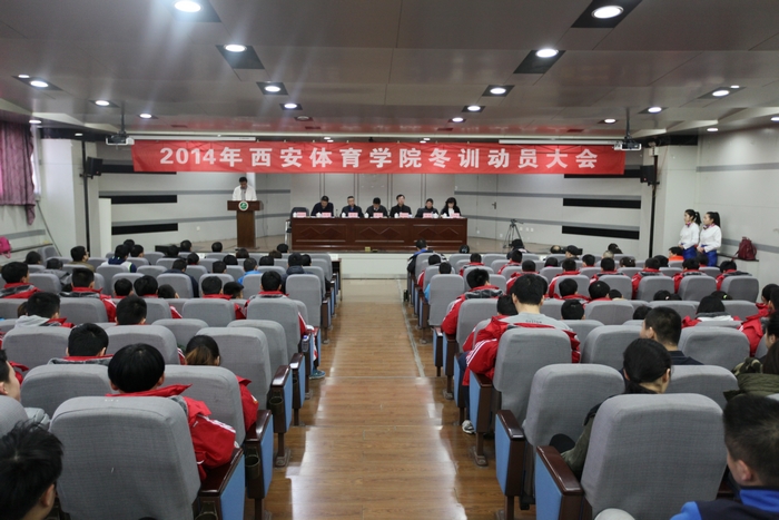 本网讯12月16日,我院2014年度冬训动员暨表彰大会在教学楼一楼报告厅召开。陕西省体育局副局长董利,我院院长周里、党委副书记朱元利,陕西省体育局竞技体育处处长邹军等出席了大会。学院相关处室负责人、竞技体育学校(拳跆中心)全体教练员、运动员、工作人员和国家青少年竞走队全体教练员、运动员参加了本次会议。大会由竞技体育学校副校长王丽君主持。