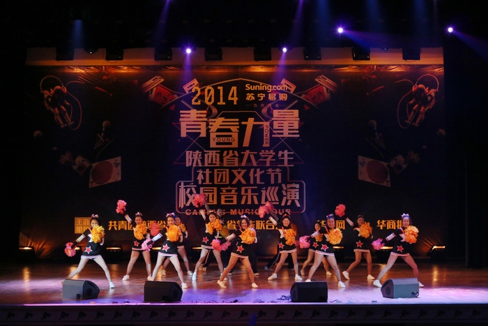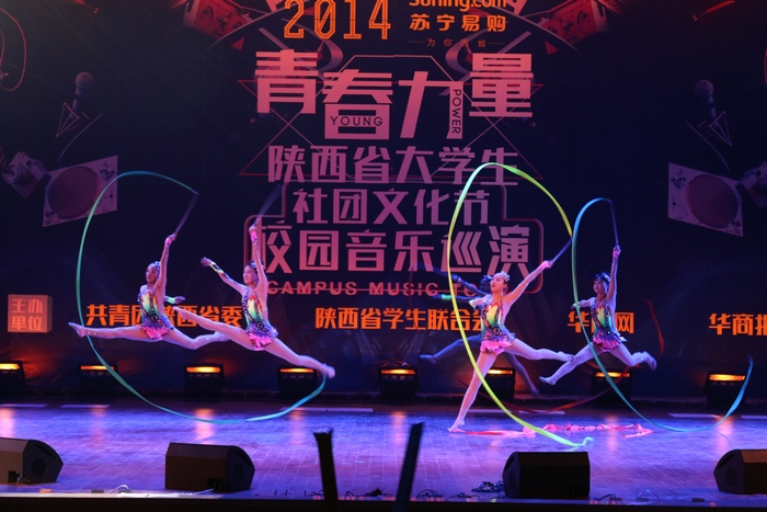晚会在我院花式篮球、跑酷、双截棍、瑜伽协会联袂表演下拉开帷幕。在炫彩的灯光、酷炫的旋律下,长安大学带来的舞蹈《千年机器人》彰显了青年的活力与热情;我院学生带来的《歌曲联唱》掀起了一个一个的小高潮;我院啦啦操、竞技健美操、艺术体操、街舞协会带来的《万象城范儿》及前不久我院齐越朗诵社在“中国梦爱国情 成才志”中华经典朗诵活动中荣获一等奖的《百年体育梦》用精彩的表演征服了观众;歌曲《花房姑娘》等歌曲凭借实力唱功和对西安满溢的热爱,赢得观众的掌声;我院武术协会带来的《武动青春》刚柔并济,完美诠释了力与美的激情,使得整场晚会熠熠生辉;华商网微信K歌达人秀得奖选手以一首《这是我的大西安》掀起此次校园音乐巡演的高潮;之后由本土摇滚乐手马飞倾情献唱,一首《回西安》赢得观众的阵阵欢呼,最后此次校园音乐巡演在他的一曲《长安县》中圆满落下帷幕。