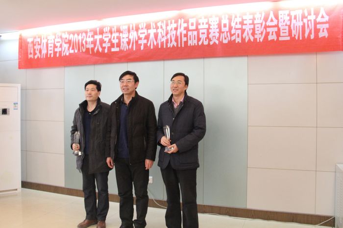 教务处处长刘新民宣读了我院第三届“挑战杯”大学生课外学术科技作品竞赛获奖名单及我院参加第九届陕西省大学生课外学术科技作品竞赛获奖名单。并对获奖学生和指导教师颁奖。任超学、李佩清、穆晓等6名教师荣获优秀指导教师称号,体育经济与体育管理系以总分340分捧得“挑战杯”,健康科学系和体育教育系分别以320分和260分捧得“优胜杯”。