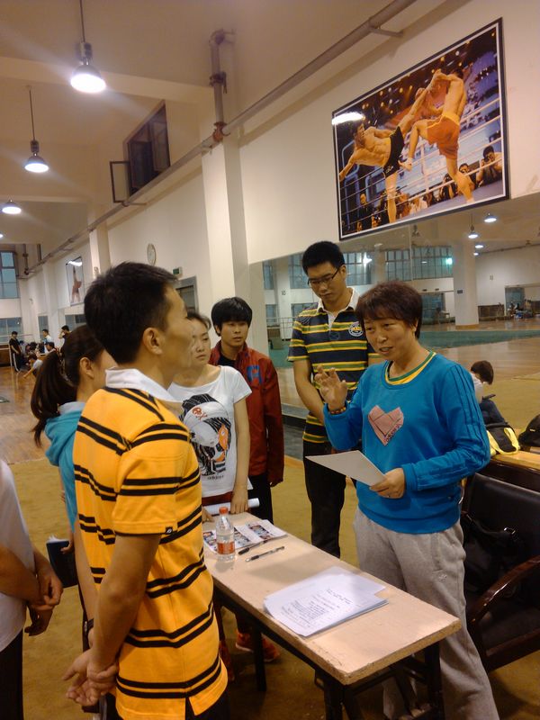 本网讯 为提高学生的教学实践能力,近日,武术系邀请西安七十中体音美教研组高级教师李海云等四位老师在套路馆举行了教师资格证模拟说课活动。武术系总支书记李美霞,年级辅导员、2009级毕业生共计70余人参加了本次活动。