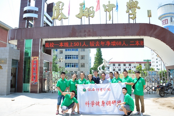 调研团首先来到有着70多年历史的西府名校凤翔中学宣传和普及科学健身知识,并在这里建立“万象城allwincity官网大学生社会实践基地”。挂牌仪式上,调研团还代表我院向凤翔中学和凤翔县东关逸夫小学分别赠送了一批体育器材。调研团的队员们还为凤翔中学部分教师进行了体质测试,并结合测试结果有针对性地进行一对一的健身指导,发放了科学健身手册,受到热烈欢迎和广泛好评。