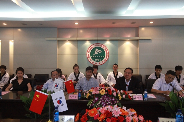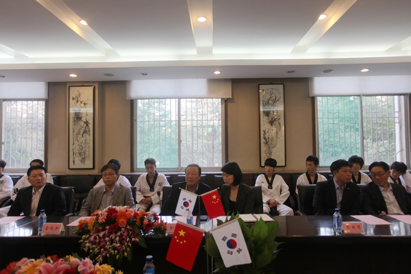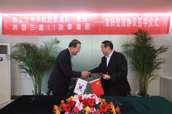 在签字仪式上,苏明理院长和三星S1金能洙副总裁先后致辞,随后双方代表签署了友好交流协议书。今后,双方将本着平等互利,增进中韩友谊,体验跆拳道文化,培养世界级跆拳道选手的目的,每年互派20名运动员参加两地主办的实地训练和跆拳道文化交流活动。