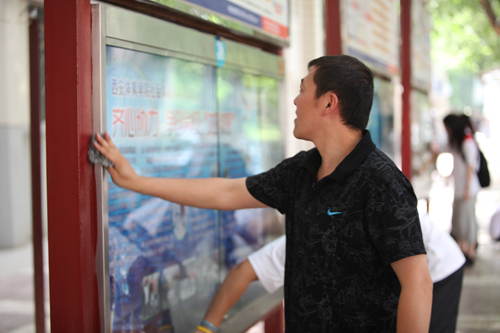 志愿者们带上水桶、拖把、清洁球、抹布等工具,通过水洗,抹布擦,甚至用指甲耐心地抠等方式,将每个宣传橱窗里里外外都擦洗得干干净净。经过两个多小时的奋战,原本布满灰尘的宣传橱窗面貌焕然一新。