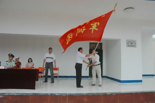 苏明理院长在会上代表学院宣布了2009级学生军训组织机构及名单。此次军训团政委与团长分别由朱元利同志与雷新声同志担任。张朝阳、宋文杰两位同志担任副团长,刘永久中校担任参谋长,蒙建军同志担任副参谋长。学院成立军训办公室,下设军事训练、宣传报道、后勤保障三个小组,军训团下辖三个营。苏院长在会上向军训团政委朱元利授旗。