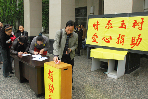 “地震无情人有情”,我院工会和团委迅速行动起来,号召师生为青海玉树地震灾区捐款。4月19日下午五点,广大师生在三个募捐箱前为灾区慷慨解囊。一笔笔捐款,一份份爱心,一片片暖流汇聚在一起,为灾区人民献上一份微薄之力。截至发稿前,师生共募集捐款近7万元。其中教职工共捐款63527元,学生共捐款5970.7元。 最让人感动的是,学院有些职工虽然收入并不高,但大家支援灾区的热情丝毫未减,几十元的捐款里面,充分体现了他们浓浓的爱心。