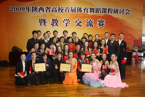 本次体育舞蹈课程研讨会暨教学交流赛,共有来自西安交通大学、陕西师范大学等7所高校、200多名运动员参加。比赛精彩纷呈,激情洋溢,我院艺术系张汕、王玉凤、任飞翔、李思菲等同学的表演更是赢得了全场观众的热烈掌声。最终,在专业组比赛中,我院学生囊括前三甲。