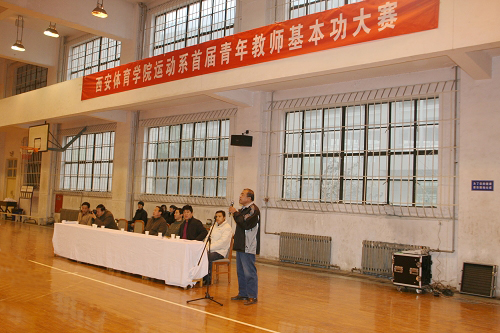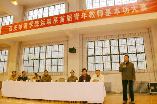 运动系主任康利则教授首先致开幕词。他指出,此次青年教师基本功大赛旨在进一步巩固运动训练专业建设成果,加强运动系青年教师的培养,使专业建设、课程建设、师资队伍建设以及教学科研训练等方面再上一个新台阶。康教授对比赛提出两点要求:一是重在参与,友谊第一、比赛第二;二是裁判员要公平、公正、准确执裁。随后,运动系足球教研室主任唐铁锋代表全体青年教师发言,表示一定尽己所能,全力发挥优势,力争在比赛中取得优异成绩。