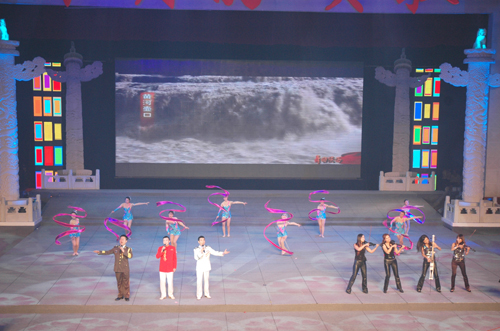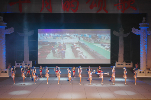 我院作为协办单位之一,主演了两套分别由艺术系、武术系精心编排的节目,为万象城争得赞誉之声。在晚会开始不久的曙光篇中,我院六个生龙活虎的舞刀健儿(扮演英勇杀敌的八路军)在前台威武亮相,赢得阵阵喝彩声。晚会第四篇章奋进篇中,由我院艺术系主演的《年轻的朋友来相会·西部放歌》主题串烧节目一上演,即将整个晚会的气氛推向高潮。健儿们以啦啦操、健美操、艺术体操等体育与艺术相结合的形式调动了所有人的活力与激情,赢得在场观众空前热烈的掌声与欢呼。在该节目中,表演者们的靓丽身影既展示了三秦大地朝气蓬勃成长着的新一代风貌,也代表着新中国的青春活力与蒸蒸日上。晚会最后在全场高歌《歌唱祖国》的热烈气氛中落下帷幕。