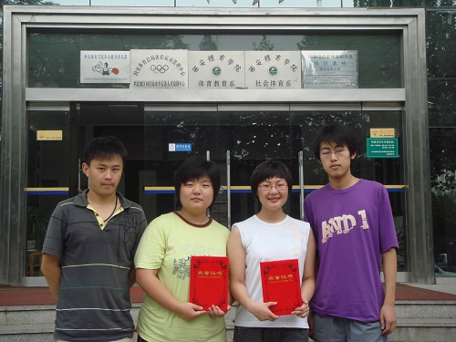 我院社会体育系高旭、吕欣徽、师帅、曲明翾四名同学通过两个多月实地调研并共同完成的《西安市学区体育发展状况调查报告》和高旭同学的《关于推动我国体育产业发展的税收思考》在第七届“挑战杯”陕西省大学生课外学术科技作品大赛上获得三等奖。我院学生首次参加比赛,为学院争得了荣誉,不仅收获了喜悦,也积累了参赛经验。