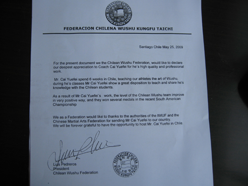 日前,我院武术系教师蔡月飞同志受国际武术联合会中国武术协会委派赴南美洲智利执行援教任务,并率领智利国家散打队在第三届南美洲武术散打锦标赛上获得了两金、三银、四铜的优异成绩,受到了智利武术协会的高度评价,被授予“最佳优秀教练员”荣誉。