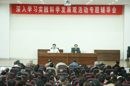 这次专题辅导报告会,是根据我院深入学习实践科学发展观活动领导小组要求进行的。党组主要负责人坚持带头学习,带头调研,带头作辅导,以自己的实际行动影响带动班子成员和广大党员干部学习实践科学发展观。