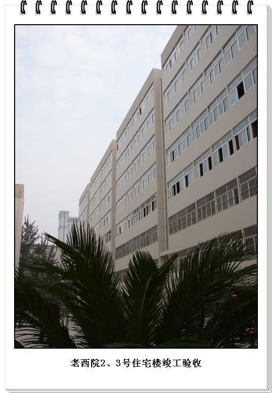 我院老西院2、3号住宅楼,2005年购回后通过招标,由西安市第三建筑工程公司中标,2006年4月10日开始施工,建筑总面积23224平方米,工程建筑面积16800平方米,均为框架七层结构。该工程施工过程中,严格实行“三检”制度,积极采取事前、事中、事后的控制管理方式,确保工程质量,经过基建科、监理单位及相关部门现场勘察验收,2、3号楼观感质量、工程质量、主要功能抽查均为合格。