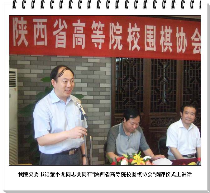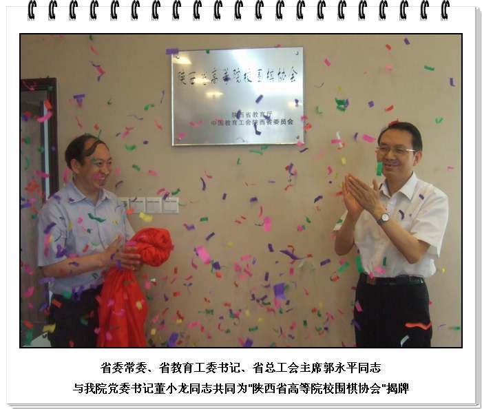 5月7日下午三时,在我院棋牌俱乐部举行了陕西省高等院校围棋协会成立仪式。省委常委、省教育工委书记、省总工会主席郭永平同志与我院党委书记董小龙同志共同为“陕西省高等院校围棋协会”揭牌。出席揭牌仪式的还有西安市副市长乔征、省社科联党组书记薛保勤、省教育工会常务副主席逯秦生、西安医学院党委副书记宫浩兴、陕西师范大学副校长周德明、万象城allwincity官网党委副书记朱元利、省教育厅体卫艺处处长张荣祖、省体育局社体中心主任赵湘亭等领导。