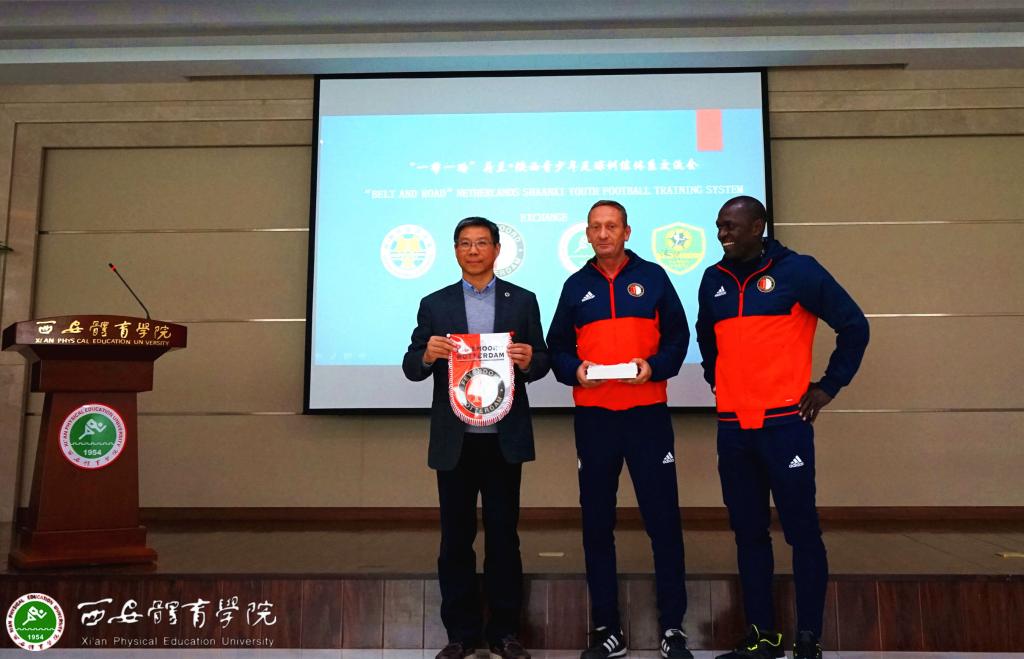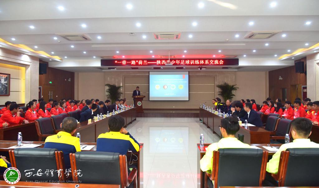 本网讯 10月27日,由我院足球学院组织的“一带一路”荷兰—陕西青少年足球训练体系交流会暨足球专业实践活动在我院新网球馆六楼大会议室举行。我院副院长文立新、足球学院负责人朱军、足球教研室主任席海龙、副主任马俊,陕西省足球管理中心副主任马冰泉,荷兰鹿特丹费耶诺德足球俱乐部国际事务总监吉多·韦德、青训教练彼得·巴伦兹、迈克·奥比库、荷兰王国驻重庆总领事馆胡玺喆以及陕西省足球管理中心、陕西浪潮足球俱乐部相关人员参加了本次活动。