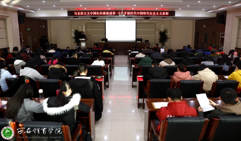 本网讯 按照院党委统一安排,12月20日上午,副院长文立新以《马克思主义中国化的最新成果——习近平新时代中国特色社会主义思想》为题,给机关党总支、计划财务处、武装保卫处、离退休管理工作办公室、体育传媒系全体人员及学生党员代表作了一堂接地气、有特色的党课讲座。讲座由机关党总支书记朱广超主持。