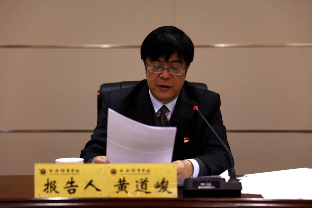 最后,黄道峻从如何推动事业发展的角度提出两点要求,一是高举旗帜,即全面贯彻落实十九大精神,坚决服从和维护以习近平同志为核心的党中央集中统一领导;坚持思想建党和制度治党相结合,提高管党治党的能力和水平;坚决把落实中央八项规定精神和杜绝“四风”化作自觉行动;强化不敢腐的震慑,扎实不能腐的笼子,增强不想腐的自觉,夺取反腐倡廉工作取得胜利。二是凝心聚力,“凝心”要树立看齐意识、导向意识、忧患意识、责任意识、为民意识、规矩意识、阵地意识、问题意识、规律意识、创新意识等十种意识;“聚力”要靠五个方面的密切配合:一靠政治建设和思想建设,二靠一个团结奋进、勇于担当、乐于奉献、廉洁自律、锐意改革创新的党委班子和基层党组织,三靠一支优秀的干部队伍,四靠我们的师生,五靠纪律建设,六靠上级部门的支持。